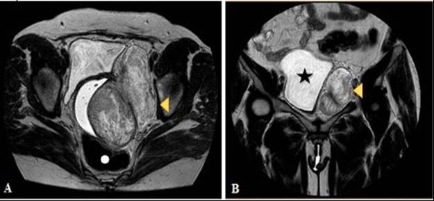 Durante la revisión al tercer mes posoperatorio, la paciente se encontraba asintomática, con signos vitales dentro de la normalidad. Sin embargo, al tacto vaginal se identificó un área indurada nodular e irregular, en pared vaginal izquierda; una segunda RMN de pelvis reportó una lesión de aspecto mesenquimal, no infiltrativa, hiperintensa en las secuencias potenciadas en T2, de aproximadamente 8 x 8 x 8 cm, que desplazaba la pared vaginal izquierda, el paquete vascular iliaco externo izquierdo, el recto inferior y la vejiga. Ante sospecha de recidiva tumoral se solicitó una ecografía endoscópica ano-rectal y se programó un control por junta oncológica tres meses después. Al sexto mes de la cirugía inicial se llevó a cabo un nuevo control por la junta oncológica de la institución, durante la revisión la paciente solo refirió sensación de masa en canal vaginal. El tacto vaginal fue similar a los realizados tres meses antes. El reporte de la ecografía endoscópica ano-rectal informó una lesión heterogénea de 6 x 2,5 cm, íntimamente adherida a la pared rectal distal con compromiso del tabique recto-vaginal y del esfínter anal externo en la región lateral derecha. Se consideró paciente con recidiva tumoral confirmada, y se ordenó inicio de tratamiento con análogos de hormona liberadora de gonadotropina (GnRH) durante tres meses.