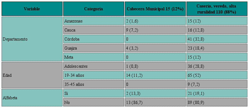 En total, 41 gestantes (el 32,8 %) procedían de Córdoba, 27 de La Guajira (el 21,6 %), 25 del Cauca (20,0 %), 17 del Amazonas (13,6 %) y 15 del Meta (12 %) (tabla 1).