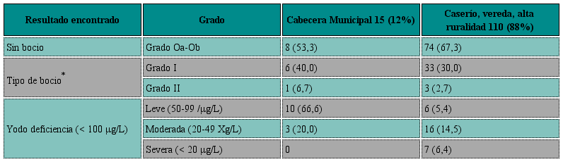 En la literatura internacional se ha identificado un estudio realizado en áreas no metropolitanas australianas que mostró que las concentraciones urinarias medias de yodo en los adultos jóvenes indígenas residentes en la cabecera municipal [67,0 μg/L (IQR, 51-90 μg/L)] fueron mayores que las de los indígenas que residían fuera de la cabecera municipal (caseríos, veredas, alta ruralidad) [53,0 μg/L (IQR, 28-75 μg/L)] (p=0.01). En dicho estudio, no se incluyeron mujeres embarazadas de manera representativa y no se evaluó la escolaridad 24. La deficiencia de yodo también ha sido descrita en Dinamarca con mujeres embarazadas, el nivel educativo fue evaluado, observándose que las embarazadas que carecían de educación tenían más bajos niveles en la concentración urinaria media de yodo 4. Otro estudio realizado en Etiopía incluyó mujeres embarazadas, observando que la falta de educación aumentaba significativamente el riesgo de desarrollar bocio (OR=2,71 IC 95 % 1,54-4,79) 5. Los hallazgos acá realizados en cuanto a la pobreza y poca educación también son consistentes con esos estudios.