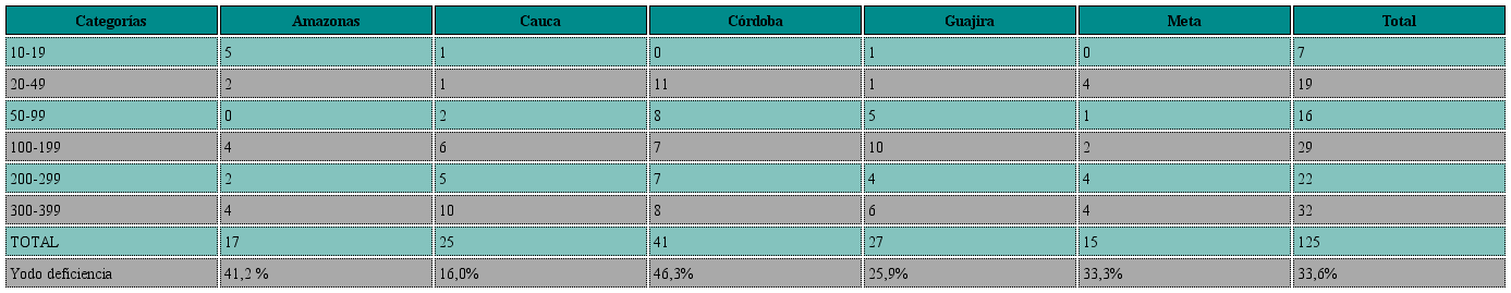 La región donde se observó una mayor proporción de yodo deficiencia severa fue el departamento de Amazonas, la menor proporción de yodo deficiencia severa fue en los departamentos del Cauca y La Guajira. No se observó yodo deficiencia severa en los departamentos de Córdoba y Meta (tabla 3).