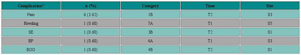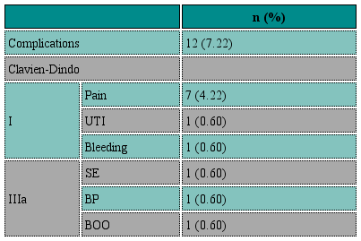The complications incidence during the first 12 months, was 8.33% (12/144); no complications have been recorded to date after that point. Our findings, according to the Clavien-Dindo classification, were: 9 (5.42%) Clavien I; 7 had pain, with 6 cases of groin pain (3.62) and 1 (0.6%) spinal headache; 1 (0.6%) urinary tract infection (UTI) and 1 (0.6%) bleeding. Another 3 were Clavien IIIa, including 1 (0.6%) sling extrusion (SE), 1 (0.6%) bladder outlet obstruction (BOO), and 1 (0.6%) bladder perforation, all of which required surgical intervention. According to the IUGA-ICS classification of mesh, tape, and graft surgery complications, groin pain was the most frequent complication (3.62%) (Table 3).