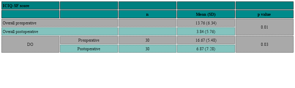Measured variables: Baseline demographic data, age, weight, height, and BMI (kg/m2). Clinical data at the time of surgery such as pelvic organ prolapse, incontinence severity and detrusor overactivity (DO) were recorded. Complications were defined according to the modified Clavien-Dindo classification and the Classification of Complications Related Directly to the Insertion of Prostheses (Meshes, Implants, Tapes) or Grafts in Female Pelvic Floor Surgery by the International Urogynecological Association (IUGA)/ International Continence Society (ICS). We evaluated subjective cure rate and Qol using the ICIQ-SF score before and after surgery. The terms used in this study follow the standardized terminology for female pelvic floor disorders of the IUGA/ICS joint report 2.