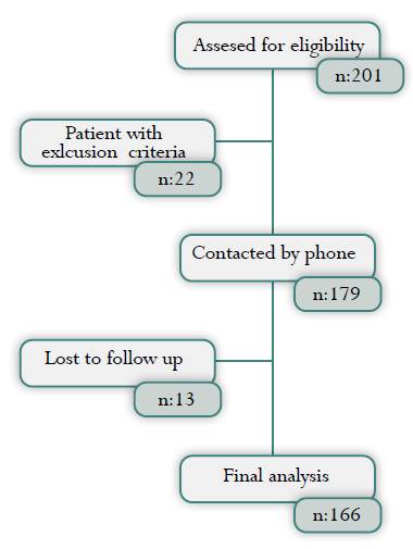 A total of 201 consecutive patients underwent TVT-O surgery, 22 women had exclusion criteria (5 had previous anti-incontinence surgery, 17 had concomitant vaginal surgery), and 13 of 179 patients (7%) were lost to follow-up (9 did not attend the consultation appointment, 4 did not complete the ICIQ-SF), resulting in 166 (82%) individuals included in the analysis (Fig 1). Of all patients in our historical cohort, n: 144, 88, 61 and 14 were seen at 12, 24, 36 and 48 months, respectively.