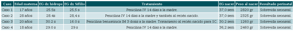 Materiales y métodos: Se presentan 4 casos de sífilis congénita con hídrops fetal. La edad materna varió entre 17 y 28 años, la edad gestacional al momento del diagnóstico estuvo entre 25 y 30 semanas, dos de ellas no habían iniciado control prenatal en ese momento. En tres casos se dio tratamiento para sífilis gestacional inmediatamente con penicilina cristalina entre 6 y 12 semanas antes del parto y se formuló tratamiento a la pareja con penicilina benzatínica. Respecto a los recién nacidos, dos de ellos no tenían infección activa o secuelas, se consideró que uno de ellos tenía sífilis congénita por títulos de prueba no treponémica. En uno de los casos, la paciente no alcanza a recibir tratamiento para la sífilis gestacional antes del parto, este recién nacido tenía signos de infección activa. Se hizo una revisión de la literatura en las bases de datos Medline, LILACS y google scholar; los términos de búsqueda fueron los siguientes: “hídrops fetal”, “lues”, “syphilis - prenatal diagnosis- ultrasound - penicilina - treatment”. Se buscaron reportes y series de casos o cohortes de recién nacidos con sífilis gestacional con hídrops fetalis. Se extrajo información sobre la madre y el recién nacido respecto al tratamiento.