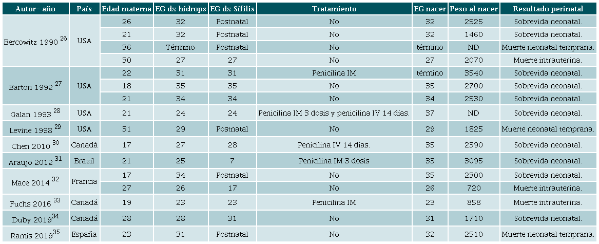 La edad materna de los casos publicados está entre los 17 y 33 años 29,32, con un promedio de 22,5 años, la edad gestacional al momento del diagnóstico de la sífilis está entre 7 y 35 27,31 semanas, con un promedio de 20,7 semanas, pero en 6 casos (37,5%) el diagnóstico fue posnatal 29,29,32,35. La edad gestacional al momento del diagnóstico del hídrops está entre 23 y 35 27,33 semanas con un promedio de 28,9 semanas.