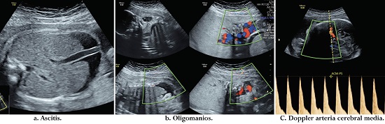 Examen físico: frecuencia cardiaca 78 latidos por minuto (lpm), presión arterial 105/ 60 mmHg. Altura uterina de 25 cm y fetocardia 149 lpm. Hallazgos positivos: altura uterina de 26 cm y fetocardia 139 latidos por minuto (LPM). Se toman paraclínicos: hemograma normal: Hb: 11 mg/ dl, creatinina: 0.5 mg/ dl. Hepatitis B: negativo, prueba VIH: negativa, prueba treponémica rápida: positiva, prueba no treponémica (VDRL) positiva en 1: 64 diluciones. Se realiza el diagnóstico de caso probable de sífilis gestacional. Ecografía: biometría para 25 semanas, crecimiento fetal normal. Hallazgos positivos: hídrops fetal con presencia de ascitis, derrame pericárdico, hidrocele bilateral; además, presencia de hepatomegalia y oligoamnios. ILA. 4 cm. El doppler evidencia anemia fetal severa (Figura 1).