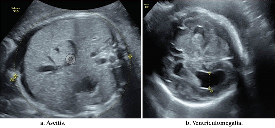 Mujer de 17 años, oriunda y residente de Bogotá, en unión libre, que ingresa a la institución el 03 de agosto de 2017. Fue remitida del servicio de consulta externa al servicio de urgencias, con gestación de 25,5 semanas, por hallazgos ecográficos anormales. Antecedentes médicos negativos. Antecedentes gineco-obstétricos: 2 gestaciones, 1 parto, sin abortos previos. Inició el control prenatal en la semana 11, y realizó tres controles prenatales sin alteraciones. Se realizaron dos pruebas treponémicas rápidas negativas.