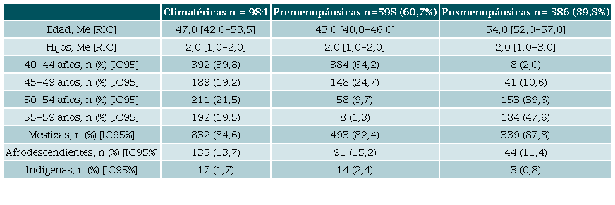 En los primeros cinco días de junio de 2020 se recibieron 1,012 formularios, 28 (2,7%) tuvieron datos incompletos y fueron descartados. Se incluyó en el análisis un total de 984 mujeres, la mediana de edad de la muestra fue 47,0 años [RIC: 42,0-53,5]. Del total, el 84,5% de las mujeres encuestadas eran mestizas, el 13,7% afrodescendientes y el 1,7% indígenas; 39,3% estaban en posmenopausia. La mediana del número de hijos fue: Me [RIC] 2,0 [1,0-2,0] (Tabla 1).