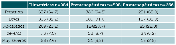 Resultados: Participaron 984 mujeres, la mediana de edad fue 47,0 [RIC: 42,0-53,5] años. El 84,5% de las participantes eran mestizas, el 13,7% afrodescendientes y 1,7% indígenas. El 39,3% posmenopáusicas. El 70% residían en la región caribe colombiana. Informaron PDS 637 (64,7%) de las participantes y 112 (11,3%) tenían PDS severos. Las posmenopáusicas informaron un 65,1% de PDS, en forma severa el 10,1%, y las premenopáusicas informaron 64,5%, en forma severa el 12,2%.