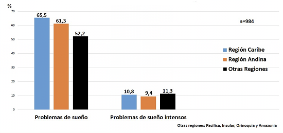 Nuestros datos son superiores a los informados por Pappa et al. 28, en un metaanálisis de cinco estudios identificaron prevalencia de insomnio del 34,3% en trabajadores del área de la salud. Por su parte, Kokou-Kpolou et al. 29, en un estudio que contó con población general francesa bajo confinamiento por la pandemia COVID-19, que incluía un 75,5% de mujeres, observaron insomnio en el 19.1%. Además, Gualano et al. 10, quienes trabajaron con población general italiana bajo confinamiento por COVID-19, encontraron a través de un cuestionario de calidad de la salud, que el 42,2% manifestaron PDS, y entre ellos, en el 17,4% observó insomnio moderado y severo. En población colombiana, recientemente se han publicado estudios de Monterrosa-Castro et al. 30 y de Parra-Saavedra et al. 31. Los primeros en 531 médicos generales colombianos, 59,5% mujeres, evaluados durante la pandemia COVID-19 para establecer estrés laboral, miedo y síntomas psicosomáticos relacionados con la pandemia, encontraron que el 32,7% presentaban pesadillas con el virus, el 43,1% se sentían imposibilitados para dormir, y el 53,9% no dormían porque les preocupaba el COVID-19. En el otro estudio, llevado a cabo con 946 gestantes colombianas, el 49,1% manifestaron presentar insomnio, al interrogarles diferentes síntomas psicológicos. Las diferencias entre los estudios se explican por las herramientas de medición utilizadas, como las situaciones medio ambientales en las cuales se encontraban las evaluadas.