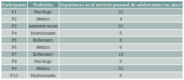 Procedimiento. Los participantes fueron contactados de forma presencial por la investigadora, quien condujo posteriormente las entrevistas, dentro de los locales donde se ofrece el servicio de atención prenatal. Los datos fueron recogidos mediante entrevistas individuales y un grupo focal. Se realizaron entrevistas semiestructuradas a cada participante, las cuales tuvieron una duración media de 32,5 minutos. Las entrevistas permitieron profundizar al equipo de investigación en las experiencias profesionales de los participantes. Posteriormente, se realizó un grupo focal con cinco especialistas del equipo multidisciplinar. Este ejercicio tuvo una duración de 72 minutos, contando con una coordinadora y una co-coordinadora, quien asumió roles de observadora y relatora, ambas psicólogas con experiencia para el trabajo con grupos. Con el consentimiento de los participantes, las entrevistas fueron registradas en audio para su posterior transcripción y análisis.