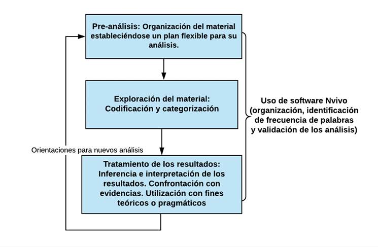 Como parte de la investigación, se llevó a cabo una etapa de aculturación con la inmersión de las investigadoras en el campo, mediante la participación en las actividades habituales del servicio, lo que permitió identificar prácticas usuales en el servicio de salud. Consecutivamente, se aplicaron las técnicas de recolección y procesamiento de datos. Los datos fueron examinados mediante la técnica de análisis de contenido temático propuesta por Bardin 26 (Figura 1). Para ello, los textos fueron leídos cuidadosamente y de manera independiente por dos investigadoras para su familiarización inicial con el material y con el contexto en el cual fue producido, aprehendiendo las ideas principales y sus significados generales 27. Producto de la lectura reflexiva, fueron identificadas las unidades de análisis, las temáticas más recurrentes y relevantes, se generaron códigos, y se elaboraron las categorías, las cuales fueron refinadas en un proceso de discusión entre pares. El software NVivo versión 11 (QSR International MA, USA) auxilió al equipo de investigación en la identificación de la frecuencia de palabras y el conteo de códigos, facilitando la elaboración de categorías temáticas. Este programa contribuyó a la organización del material, codificación, elaboración de representaciones gráficas para las relaciones entre temas emergentes y categorías, así como en la validación de los análisis realizados por el equipo de investigación para la definición de las categorías. Con el fin de garantizar la confiabilidad de los datos, las categorías elaboradas fueron discutidas y validadas entre el equipo de investigación y el grupo de pesquisa Saúde Reprodutiva e Hábitos Saudáveis (SARHAS-UNICAMP).