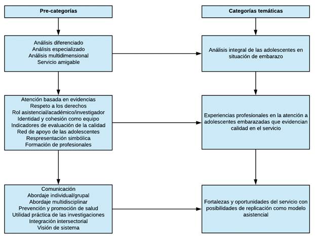 Se elaboraron tres categorías temáticas emergentes de los discursos de los profesionales y de las evidencias en la literatura sobre servicios de salud para adolescentes y para la atención prenatal: a) análisis integral de las adolescentes en situación de embarazo; b) experiencias profesionales en la atención a las adolescentes embarazadas que evidencian calidad en el servicio; y c) fortalezas y oportunidades del servicio con posibilidades de replicación como modelo asistencial (Figura 3).