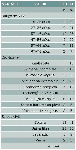 Caracterización sociodemográfica: las 44 participantes cuyos registros se analizaron eran colombianas afrodescendientes; con edad promedio de 45 años, rango entre 16 y 75 años. La escolaridad predominante (20 %) fue bachillerato incompleto, y 7 mujeres (16 %) eran analfabetas (tabla 1). De las participantes, 18 (41 %) se encontraban en Quibdó y 26 (59 %) en Nueva Bellavista. La mayoría mantenía algún tipo de relación de pareja, con mayor frecuencia de unión libre (22 mujeres [52 %]).