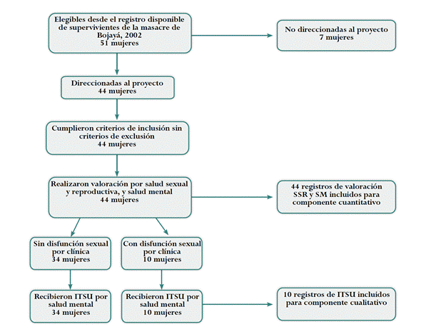 Componente cuantitativo. Como criterios de inclusión se tomaron en cuenta: ser supervivientes directas del AEI utilizado en la masacre de Bojayá; considerar que requerían una valoración de SSR y no haber recibido una valoración de este tipo desde el ataque a la población; habitar en los cascos urbanos de Quibdó y Nueva Bellavista, o en áreas rurales cercanas. Como criterio de exclusión se tuvo no aceptar la participación voluntaria.