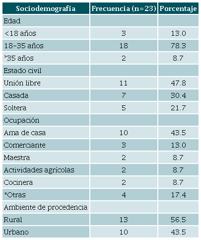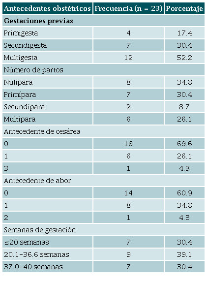 La población de estudio se caracterizó por estar constituida por mujeres jóvenes, cuya edad promedio fue de 25 (DE ±6 años), con compañero (78,3 %), con ocupación ama de casa (43,5 %), todas procedentes del departamento de Comayagua, predominantemente de origen rural (56,5 %) (Tabla 1). Las gestantes fueron preponderantemente nulíparas (34,8 %), con antecedentes de cesárea o aborto (30 % y 39,1 % respectivamente), con una edad gestacional promedio al momento del diagnóstico COVID-19 de 26 semanas (rango 5 a 40 semanas). El 3,4 % de la población cursó con embarazo múltiple al ingreso (Tabla 2). El 26,1 % presentó alguna comorbilidad como hipertensión (4,3 %), obesidad y asma bronquial, aquellas documentadas con mayor frecuencia. Epidemiológicamente, sólo se diagnosticó "Nexo COVID-19 positivo" en dos gestantes incluidas en el estudio (8,7 %) (Tabla 3). El cuadro clínico inicial consistió en fiebre (95,6 %), odinofagia (34,7 %), anosmia (34,7 %) o cefalea (34,7 %), con media de temperatura de 38,5°C (+/-0,5, rango: 38,0-39,5), frecuencia cardiaca mayor a 100 latidos /minuto (52,1 %).