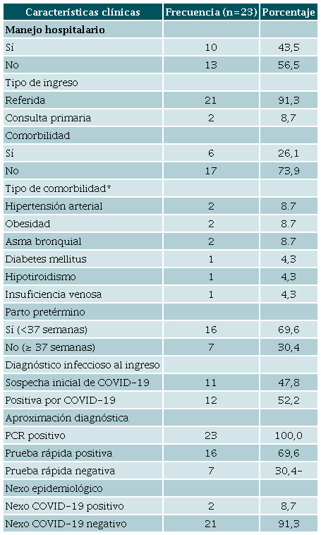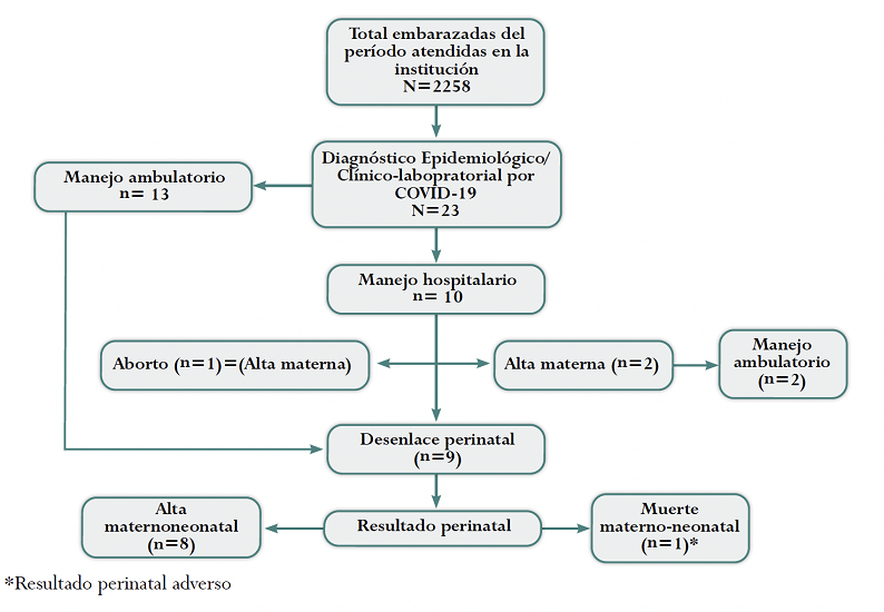 Resultados: En el periodo descrito consultaron 2.258 gestantes, de estas se incluyeron 23, quienes cumplieron con los criterios de selección, para una frecuencia de infección por COVID-19 del 1,01 %. La población de estudio se caracterizó por estar constituida por mujeres jóvenes y en unión libre. Trece pacientes recibieron manejo ambulatorio por cuadro clínico leve, diez requirieron hospitalización. Las embarazadas manejadas ambulatoriamente finalizaron la gestación vía cesárea (76,9 %) por estado fetal insaisfactorio, con edad gestacional mayor o igual a 37 semanas, y tres casos fueron pretérmino (36 semanas). De las gestantes hospitalizadas, una desarrolló aborto espontáneo, y nueve finalizaron la gestación por una indicación obstétrica. Se presentó un parto prematuro y se documentó una muerte materna (4 %) y neonatal.