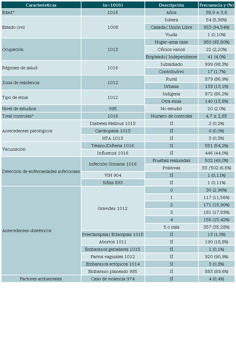 De este grupo, el 94,5 % reportó tener una pareja estable y el 5,36 % estar soltera; 93,80 % se dedicaba a las labores del hogar, 98 % eran escolarizadas y el 4 % manifestó algún tipo de trabajo independiente. De estas mujeres, el 98,3 % era del régimen subsidiado, el 86,9 % residía en zona rural, y 86,2 % declaró pertenecer a la etnia indígena (Tabla 1).