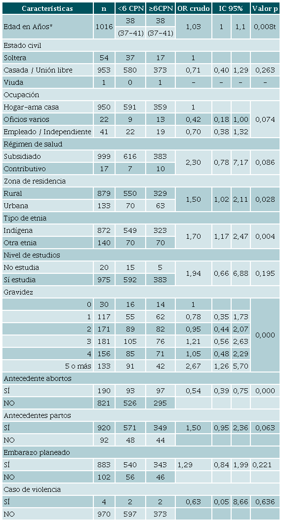 Variables medidas: se analizó información demográfica: edad, estado civil, ocupación, grupo étnico, régimen de salud, escolarización, zona de residencia; antecedentes obstétricos, número de embarazos, embarazos gemelares, número de abortos, embarazos ectópicos, número de cesáreas, partos vaginales, historia de preeclampsia/eclampsia y riesgos obstétricos y violencia; en la información clínica se incluyeron variables como antecedentes patológicos: diabetes mellitus, cardiopatía, HTA; y variables de seguimiento del control prenatal como infección urinaria, VIH, sífilis, esquema de vacunación para tétano-difteria e influenza. El cumplimiento del control prenatal se definió como la asistencia a seis o más visitas atendidas por el personal de salud del programa, según la recomendación del Ministerio de Salud 17.