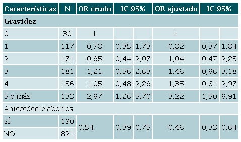 El análisis multivariado de la regresión logística binomial incluyó 12 variables, y el modelo parsimonioso presentó dos variables independientes: antecedentes de aborto (OR ajustado: 0,46 IC 95 % 0,33-064) y una gravidez de cinco o más (OR ajustado: 3,22; IC 95 % 1,50-6,91) (Tabla 3).