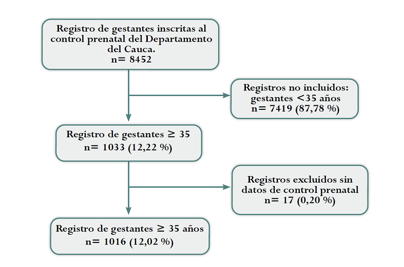 Diseño y población: se realizó un estudio descriptivo de corte transversal, con recolección de la información de manera retrospectiva. Se incluyeron gestantes entre 35 y 41 años afiliadas a la EAPB AIC-I e inscritas al programa de CPN, quienes fueron atendidas en las instituciones prestadoras de salud de 32 municipios del departamento del Cauca, Colombia, entre el 2016 y 2018. La EAPB es una empresa aseguradora privada del régimen subsidiado por el Estado en el Sistema de Seguridad Social en Colombia, que funciona desde 1997 con cobertura en los departamentos del Cauca, Huila, Putumayo, Valle y Antioquía, con 8452 afiliados. Se excluyeron las pacientes sin información completa del seguimiento. Se hizo muestreo consecutivo, por lo que se prescindió tanto de un cálculo de tamaño de muestra como de una estrategia de muestreo.