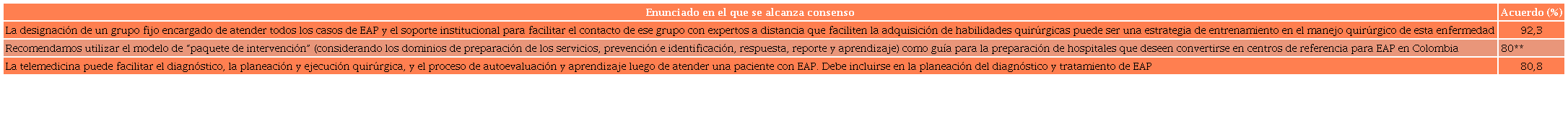 Materiales y métodos: En el consenso participaron 23 panelistas, quienes respondieron 31 preguntas sobre el tratamiento de EAP. Los panelistas fueron seleccionados con base en la participación en dos encuestas realizadas para determinar la capacidad resolutiva de hospitales en el país y la región. Se utilizó la metodología Delphi modificada, incorporando dos rondas sucesivas de discusión. Para emitir las recomendaciones el grupo tomó en cuenta la opinión de los participantes, que lograron un consenso mayor al 80 %, así como las barreras y los facilitadores para su implementación.