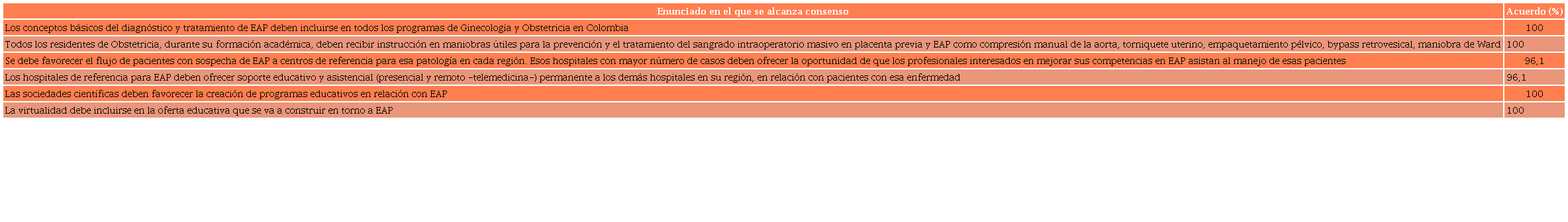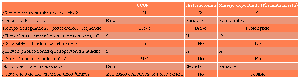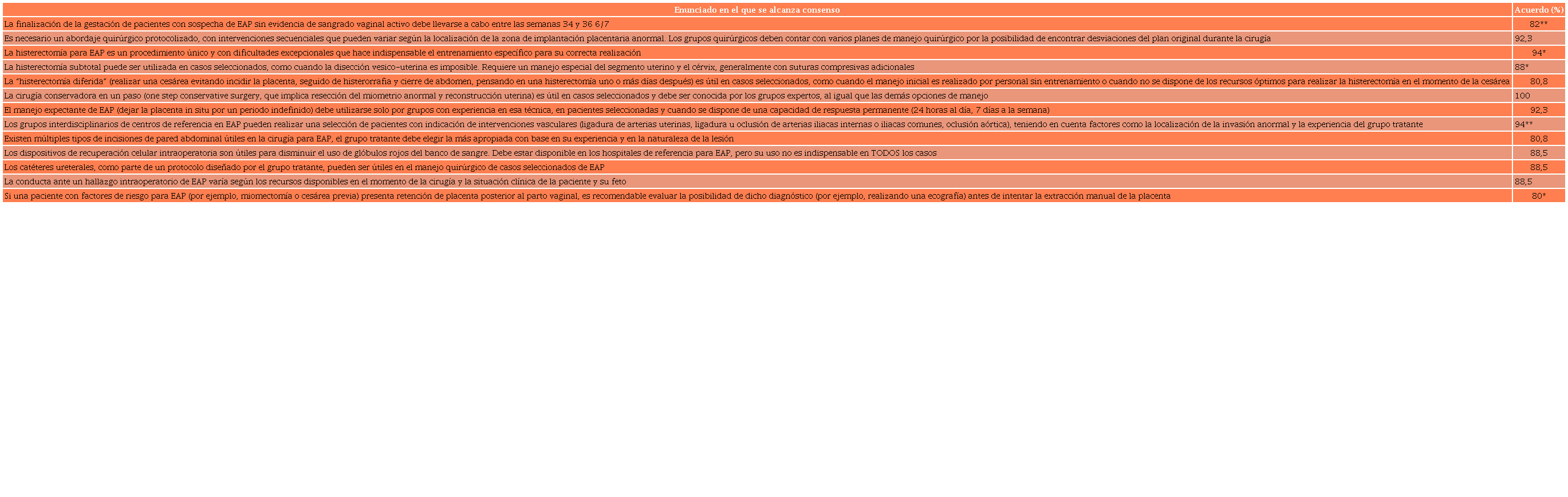 Aspectos no abordados por el consenso: diagnóstico de EAP (prenatal e histopatológico), consideraciones anestésicas, descripción de las técnicas quirúrgicas de cada una de las opciones de manejo, terapia endovascular para EAP, infección posterior al tratamiento quirúrgico, compromiso de órganos extragenitales por el EAP, manejo transfusional y de hemocomponentes, manejo de la cicatriz de cesárea en el embarazo, manejo del recién nacido producto de gestación complicada con EAP.