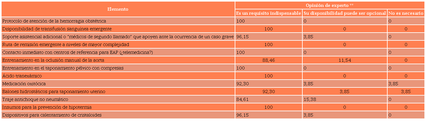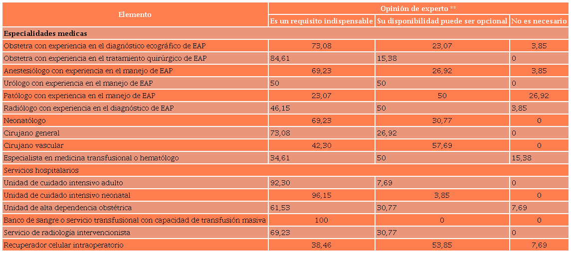 Barreras. Si bien los integrantes del equipo deben responder a las particularidades del protocolo de manejo aplicado en cada hospital, y dependen de los recursos disponibles a nivel local, hay especialidades que la mayoría de los panelistas consideraron un "requisito indispensable" y otras que los participantes del consenso consideran que podrían tener "disponibilidad opcional".