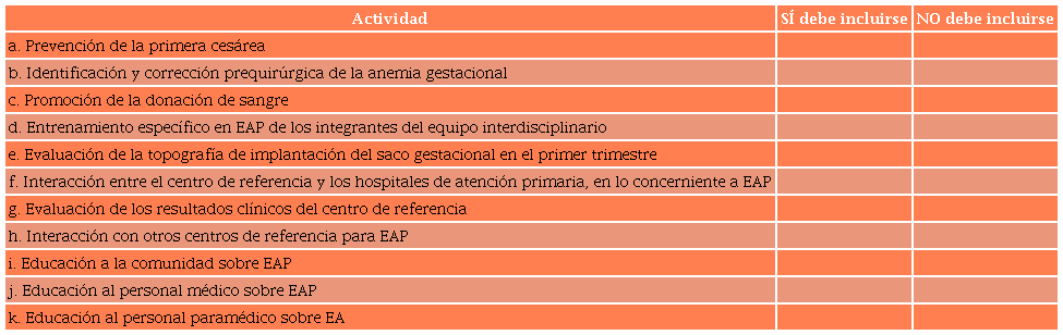 Justificación. Se ha descrito que cuando un grupo médico se expone de manera repetitiva a EAP y aplica políticas de calidad, los resultados mejoran 47 en relación con un menor volumen de sangrado, menor número de transfusiones 46 y menor requerimiento de intervenciones endovasculares. Sin embargo, la mayoría de los hospitales colombianos reporta atención de menos de seis mujeres afectadas por EAP por año 30, por lo que resulta difícil que los obstetras de manera individual se expongan ampliamente a la enfermedad y se obtengan mejores resultados en salud para las gestantes con EAP. Las actividades que esos equipos interdisciplinarios deben llevar a cabo incluyen tareas múltiples, mucho más allá de establecer el diagnóstico de EAP o llevar a cabo una cirugía compleja (Tabla 4). El modelo de paquete de intervención ofrece ventajas sobre iniciativas previas enfocadas en la respuesta a la situación crítica, ya que se incluyen actividades de preparación de las instituciones de salud, mucho antes de que se presente la emergencia, así como actividades de monitoreo de los resultados clínicos ligados a aprendizaje dirigido a mejorar la respuesta a futuras situaciones 48.