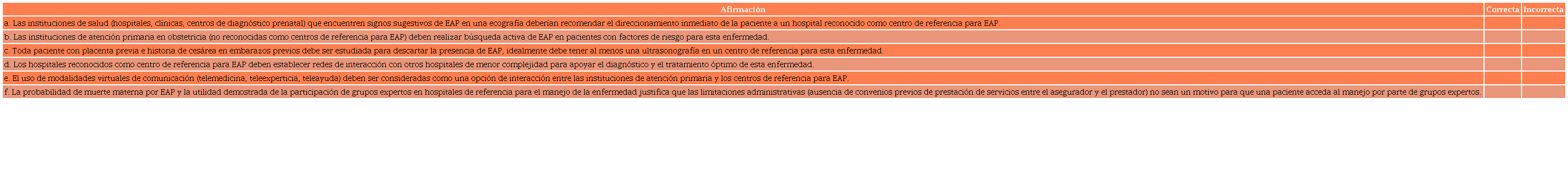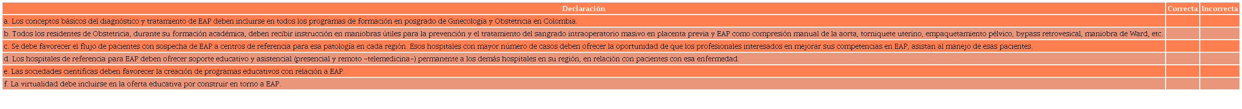 30. El entrenamiento del personal médico en el diagnóstico y manejo de EAP es un factor determinante de los resultados clínicos. ¿Cuál es su opinión sobre cada una de las siguientes afirmaciones? Seleccione con una "X" si considera correcta o incorrecta cada una de las siguientes declaraciones.