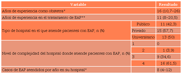 Los panelistas elegibles para participar fueron contactados vía correo electrónico y vía telefónica. Se seleccionaron ginecólogos y obstetras (incluidos obstetras expertos en el manejo quirúrgico de EAP, especialistas en medicina materno-fetal, especialistas en cuidado crítico obstétrico, gineco-oncólogos) que trabajan en instituciones colombianas consideradas como de referencia para el manejo de patología obstétrica compleja. Para su selección se utilizó la base de datos de dos estudios previamente publicados que evaluaban la disponibilidad de hospitales con capacidad resolutiva para EAP en diferentes regiones de Colombia 28,30, además, se tuvo en cuenta la participación previa en artículos científicos de EAP y la exposición permanente al tratamiento de esta condición. Otros requisitos para ser invitados como panelistas al consenso fueron llevar a cabo de manera regular más de tres cirugías por EAP por año, durante al menos 5 años, y ser integrante de un equipo multidisciplinario para manejo de EAP.