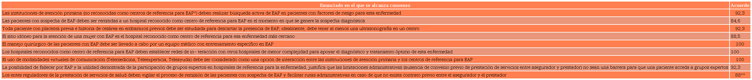 Conclusiones: esperamos que este primer consenso colombiano de EAP sirva como base para discusiones adicionales y trabajos colaborativos que mejoren los resultados clínicos de las mujeres afectadas por esta enfermedad. Evaluar la aplicabilidad y efectividad de las recomendaciones emitidas requerirá investigaciones adicionales.