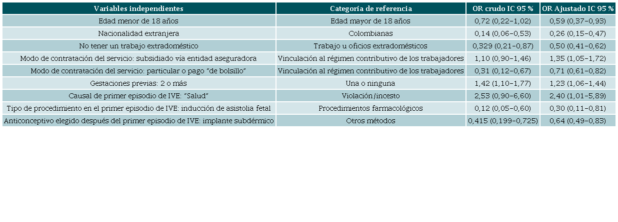 Al efectuar el ajuste multivariante (Tabla 3), el modelo final mostró como factores protectores significativos: edad menor de 18 años (ORa = 0,59; IC 95 %: 0,37-0,93), nacionalidad extranjera (ORa = 0,26; IC 95 %: 0,15-0,47), no tener trabajo extra-doméstico (ORa = 0,50; IC 95 %: 0,41-0,62), contratación del servicio particular o "de bolsillo" (ORa = 0,71; IC 95 %: 0,61-0,82), inducción de asistolia fetal como técnica empleada en la primera IVE (ORa = 0,30; IC 95 %: 0,110,81), anticonceptivo post primer IVE: implante subdérmico (ORa = 0,64; IC 95 %: 0,49-0,83); y los factores de riesgo significativos fueron: modo de contratación del servicio subsidiado (ORa = 1,35; IC 95 %: 1,05-1,72), gestaciones previas (2 o más) (ORa = 1,23; IC 95 %: 1,06-1,44), causal salud en el primer episodio de IVE (ORa = 2,40; IC 95 %: 1,01-5,89) (Tabla 3).