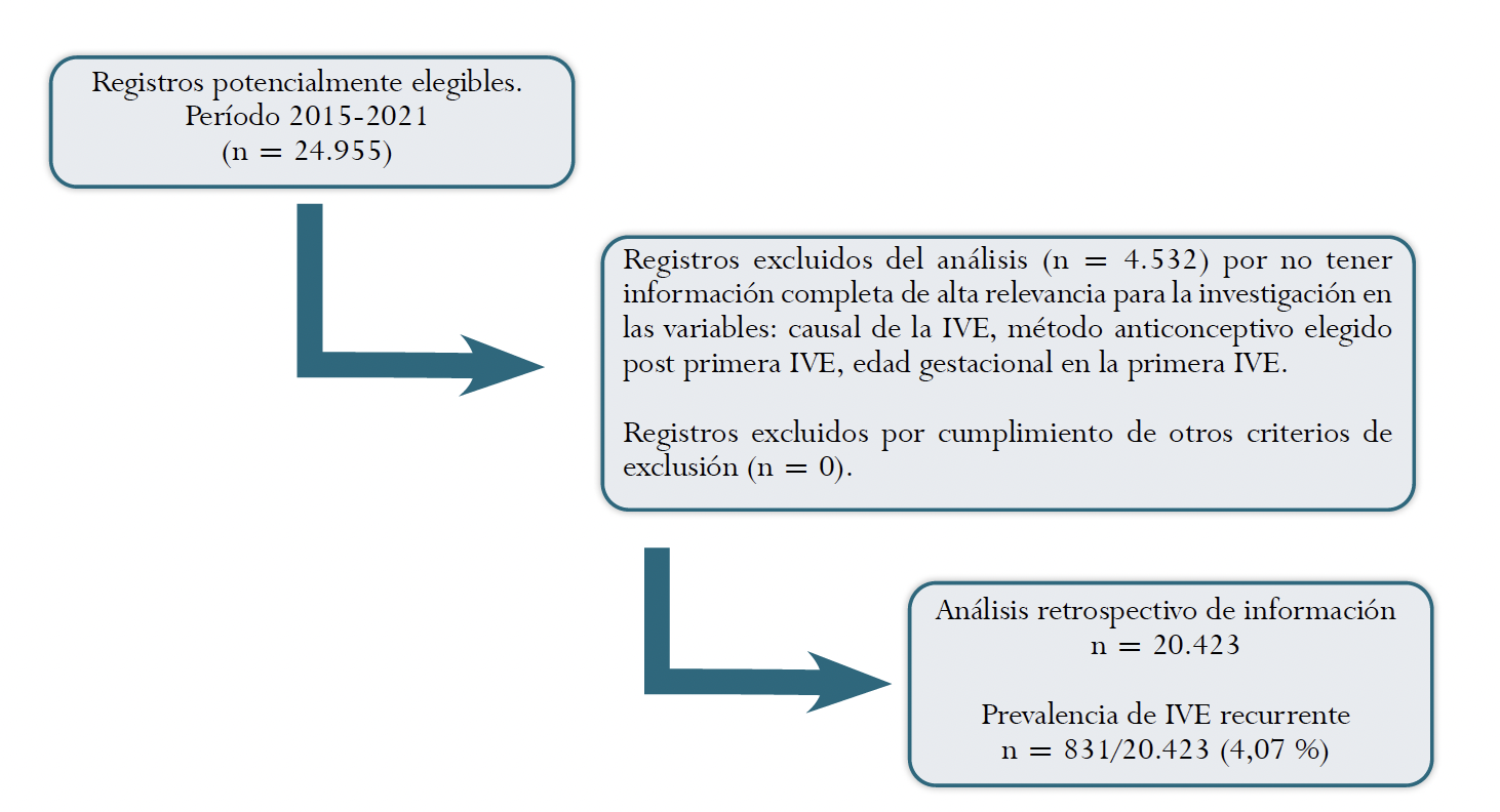 Procedimiento. A partir de la base de datos en formato Excel 365 de Microsoft Office® que contiene los registros de las IVE realizadas en la institución, la cual fue suministrada con previa autorización del comité de ética de Profamilia, se identificó la fuente de información (historia clínica) de las usuarias. Primero, se verificó el cumplimiento de los criterios de selección de las participantes, y una vez verificados se tomaron los datos de las variables de interés para el estudio, que fueron recolectadas previamente por parte del equipo médico. Se controló el sesgo de información (medición) verificando la cantidad de subregistro en las diferentes variables.