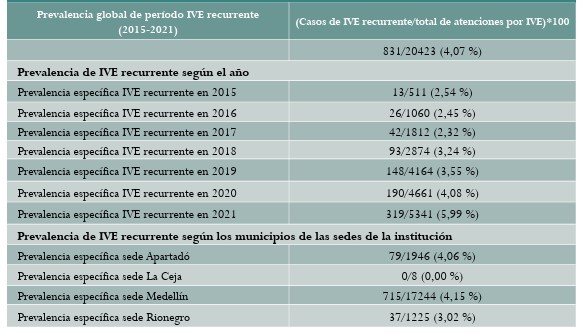 Materiales y métodos: Estudio de corte trasversal descriptivo, en el que se incluyeron mujeres atendidas entre 2015 y 2021 en cinco sedes, en el Departamento de Antioquia, de una Institución que promueve la atención en salud sexual y reproductiva (SSR) en Colombia. Se midieron variables sociodemográficas, de SSR, así como la realización de IVE recurrente, tipo de procedimiento utilizado en la primera IVE, y método de anticoncepción elegido posterior a esta. Se presenta la prevalencia de período de aborto recurrente global y por año. Se hace exploración de los factores asociados por medio de análisis multivariado. Se obtuvo aval del comité de investigación de la institución.