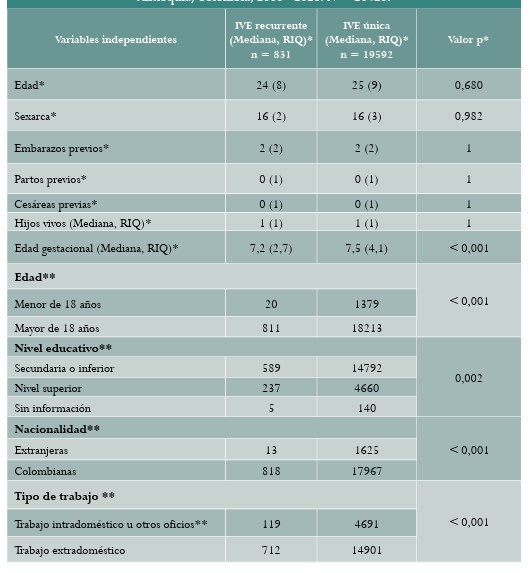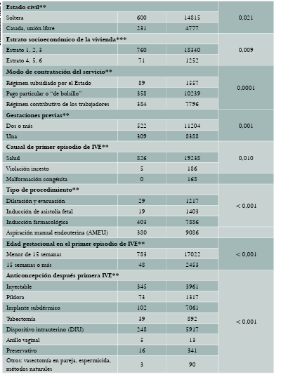Respecto a las características de la población que se había practicado al menos una IVE, se encontró que la mediana de la edad fue de 25 años (RIC 9). El 91,99 % era de nacionalidad colombiana (18.785); el 74,4 % de las mujeres eran solteras; el 95,4 % tenía residencia en zona urbana (19.481); el 75,31 % contaba con educación secundaria o inferior (15.381); el 76,5 % tenía como oficio las labores extra-domésticas (15.613). Asimismo, 93,52 % pertenecía al nivel socioeconómico bajo; sin embargo, el 51,89 % accedió al primer episodio de IVE pagando los servicios de manera particular (10.597), y el 40,05 % (8.180) lo hizo por medio de la afiliación al sistema de salud colombiano contributivo de los trabajadores; el 8,06 % (1.646) estaban afiliadas al régimen subsidiado por el Estado. La mediana de la edad de inicio de las relaciones sexuales fue de 16 años (RIC 3), y el 57,42 % (11.727) había tenido por lo menos dos gestaciones previas. El 31,51 % (6.436) tenía al menos un hijo vivo.