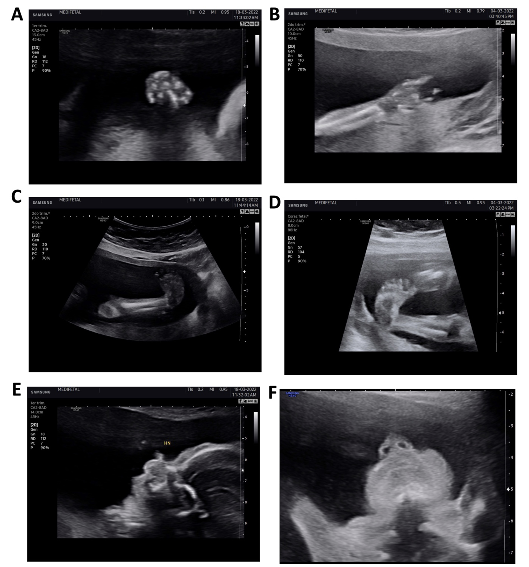 Se describe el caso de una mujer de 33 años, primigestante, atendida en una institución de salud de alta complejidad ubicada en Cartagena de Indias, Colombia, que atiende tanto a personas del régimen contributivo de los trabajadores y del régimen subsidiado por el Estado en el Sistema de General de Seguridad Social Colombia (SGSS). La paciente fue remitida para evaluación morfológica ultrasonográfica en segundo trimestre, a las 19 semanas y un día de gestación. La única patología relevante en su historial médico era un hipotiroidismo clínico en tratamiento, sin antecedentes familiares de importancia.
