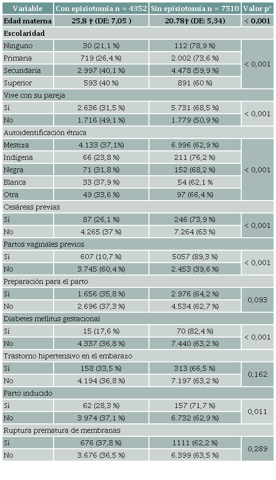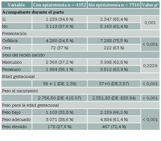 Las pacientes incluidas tuvieron una edad de 23,9 años (Desviación estándar [DE] ± 6,9), fueron mayormente primíparas (52 %), con educación secundaria o menor (87 %), con embarazo sin alteraciones (96 %), parto espontáneo (90 %). Con fetos a término (69 %), con peso promedio 2627,9 g (DE ± 767,2). Las mujeres sometidas a episiotomía tuvieron una media de 20,78 años (DE ± 5,34), no tenían partos vaginales previos y tenían menos comorbilidades en la gestación (Tabla 1). El peso al nacer fue de 2.756,50 (DE ± 615,07) y la edad gestacional de 38+1 (DE ± 2,38) (Tabla 2).