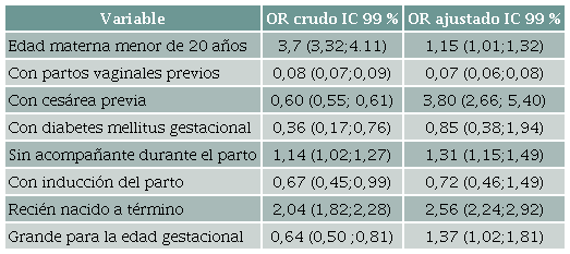 Respecto a las variables asociadas a la episiotomía se identificó que la edad materna menor a 20 años (ORa: 1,15; IC 99 %: 1,01-1,32), el no tener acompañante durante el parto (ORa: 1,31; IC 99 %: 1,15-1,49), la cesárea previa (ORa: 3,80; IC 99 %: 2,66-5,40), ser recién nacido a término (ORa: 2,56; IC 99 %: 2,242,92) y ser grande para la edad gestacional (ORa: 1,37; IC 99 %: 1,02-1,81) posiblemente incrementan el riesgo de episiotomía. Por otra parte, el antecedente de parto vaginal, posiblemente es factor protector de episiotomía (ORa: 0,07; IC 99 %: 0,06- 0,08). En cuanto a los otros factores el efecto varió (Tabla 3). Adicionalmente, la práctica de la episiotomía se asoció a desgarros perianales grados III a IV en 30 pacientes (1 %).