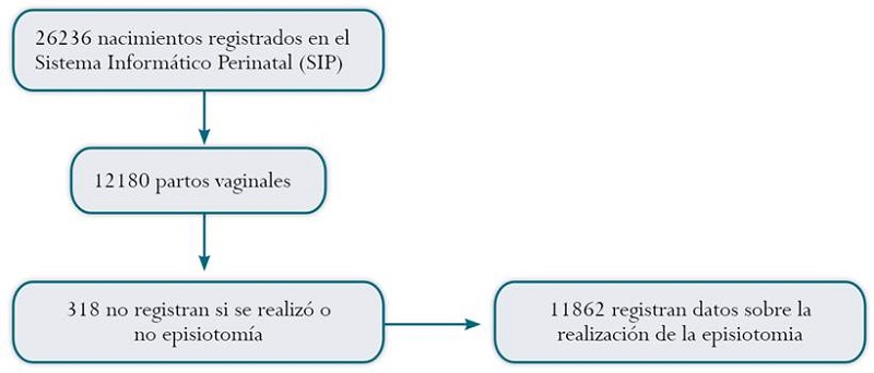 De 26.236 partos en el periodo del estudio, 12.180 fueron partos vaginales (46 %), de estos, en 11.862 se identificó información sobre si se realizó o no episiotomía. En 318 (2,5 %) no se dispuso de información (Figura 1).