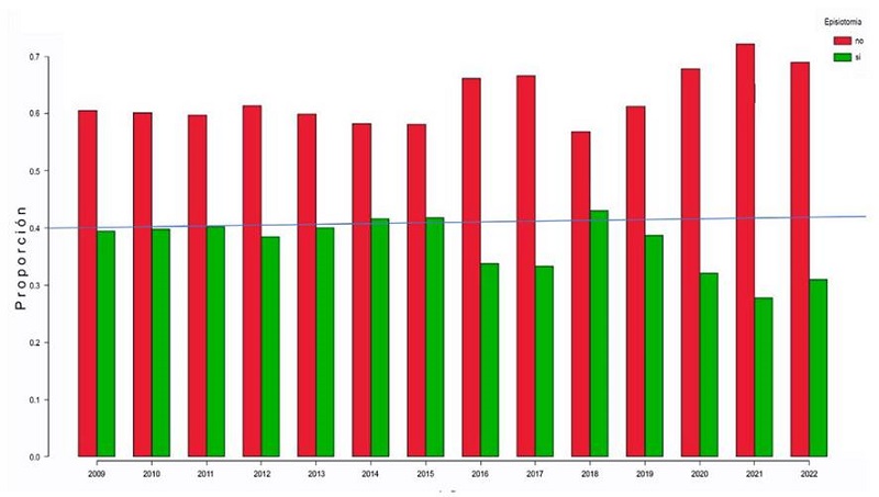 Resultados: Se analizaron 11.862 registros. La prevalencia global de episiotomía fue del 36,69%, con un máximo del 42 % y un mínimo del 28 %. Se insinúa una tendencia a la reducción de la frecuencia desde 2019 a 2022. Se encontró una asociación positiva entre su realización y la edad materna menor a 20 años, cesárea previa, ausencia de acompañante durante el parto, recién nacido a término, y grande para la edad gestacional. Se halló una asociación negativa con partos vaginales anteriores.