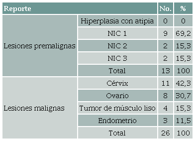 Resultado: De 816 registros clínicos se analizaron 674 casos (87 %) que cumplieron los criterios de inclusión. Predominó la población premenopáusica. Se identificaron 26 casos de enfermedad maligna no anticipada para una prevalencia del 3,8 % y 13 casos de patología premaligna (1,9 %). El origen más frecuente fue el cuello uterino (40 %) seguido del ovario (33 %).