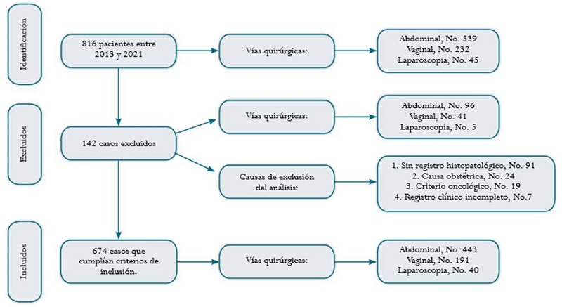 Se obtuvieron un total de 816 registros, de los cuales se eliminaron 19 por no cumplir con el criterio de inclusión de patología benigna; 24 se excluyeron por presentar histerectomías de origen obstétrico. Del total de 773 candidatas, 98 no se incluyeron en el análisis por datos incompletos (13 %) (Figura 1).