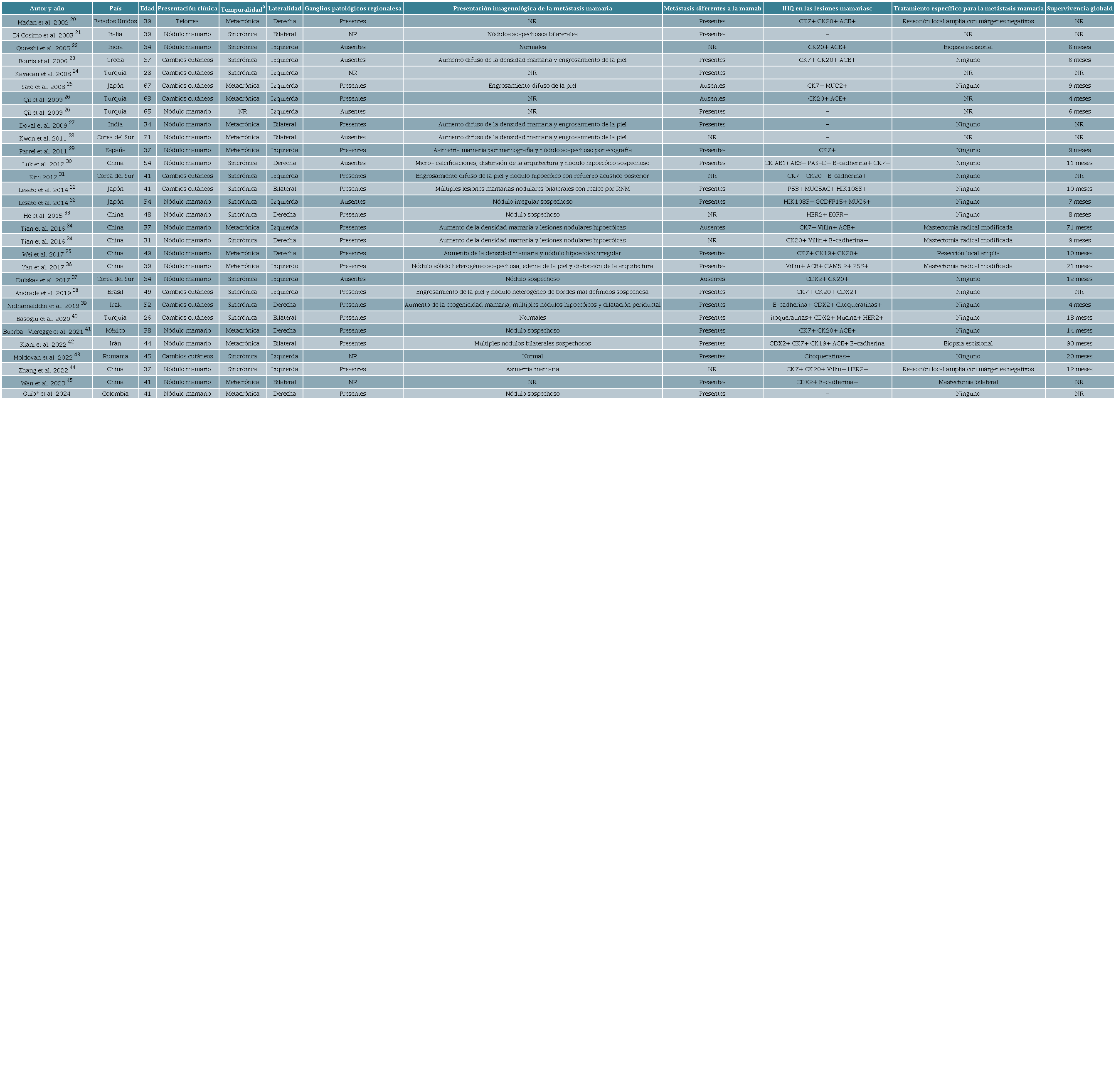 Tratamiento. Respecto al manejo de la lesión metastásica en la mama, en 9 (31 %) de las 29 pacientes se indicó algún tipo de intervención quirúrgica 20,22,34-36,42,44,45, en 4 (13,8 %) de las cuales se trató de una cirugía radical (mastectomía con o sin vaciamiento axilar) 34,36,45.