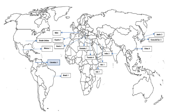 Los 26 artículos seleccionados constituyeron en su totalidad reportes de uno o máximo dos casos, para un total de 29 (tres autores reportaron 2 casos cada uno: ver tabla 1), que se ubicaron 22 en el continente asiático (75,9 %), 4 en Europa (13,7%) y tres en América (10,4 %) (figura 2). La edad media de las pacientes reportadas con AGCES metastásico a la mama fue de 42,5 años.