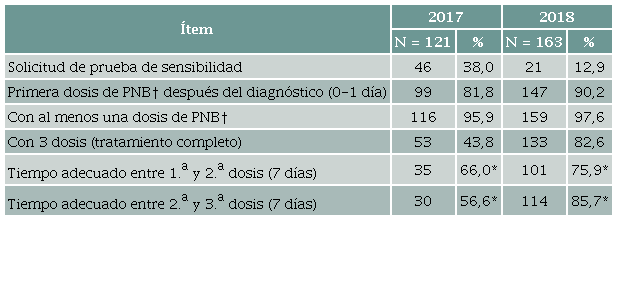 La solicitud de prueba de sensibilidad a la penicilina se hizo en 46 gestantes (38 %) en 2017 y disminuyó a 21 solicitudes (12,9 %) en 2018. No se registraron casos con necesidad de desensibilización o anafilaxia a la penicilina. En 2017, la primera dosis de penicilina se administró el mismo día de la obtención del resultado en 99 casos (81.8%), mientras que en 2018 se administró así en 147 casos (90,2 %). Más del 96 % (275) de las gestantes recibieron al menos una dosis de penicilina, sin diferencia entre los dos años (Tabla 2). Para 2017 no se encontró ningún registro sistemático del tratamiento a los contactos sexuales. En 2018, de 153 gestantes, 134 reportaron tener pareja, y a 126 de ellas (94 %) se les prescribió tratamiento. De estos, 66 contactos sexuales (52,38 %) recibieron tres dosis de penicilina; ocho (6,35 %) recibieron dos dosis; 17 (13,49 %) recibieron una dosis; y 35 no recibieron ninguna dosis (27,78 %). Respecto a la adherencia al seguimiento serológico después del tratamiento, para las 2 cohortes el control con mayor adherencia fue el de los 3 meses, alcanzando 30 % en 2017 y 38,6 % en 2018. El cumplimiento del criterio de curación solo se estableció en 60 mujeres (22,2 %), para 2017 fue 24,8 % y para 2018 fue 20,3 %.