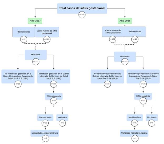 Para todos estos casos, un médico epidemiólogo y un enfermero recopilaron la información, verificando el cumplimiento de los criterios del protocolo del INS 20. Se revisó la información registrada en las fuentes seleccionadas desde el 1 de enero de 2017 hasta el 31 de diciembre de 2019, fecha límite para que todas las mujeres de ambas cohortes completaran su control serológico, de acuerdo con el Manual de la Estrategia para la Reducción de la Transmisión Perinatal del VIH y de la Sífilis Congénita 23. Se accedió a todos los resultados de VDRL (Venereal Disease Research Laboratory prueba serológica para sífilis) y pruebas treponémicas rápidas en la base de datos del laboratorio clínico. También se revisaron las historias clínicas en formato digital de los casos con diagnóstico de SG y SC según la Clasificación Internacional de Enfermedades, 10.a versión (códigos: A500 hasta A539, A65, I980, K672, M031, M731, N290, N742, O981, R762). Se incluyeron todos los casos reportados como SG o SC al Sistema Nacional de Vigilancia en Salud Pública (Sivigila). Como control de la precisión de los datos se verificó la concordancia entre las diferentes fuentes. Además, se integraron los datos de la SRS ingresados al Registro Único de Nacimientos y Defunciones (RUAF) para confirmar las terminaciones del embarazo en la SRS. La información de los casos seleccionados se registró en una base de datos en Microsoft Access®, desarrollada específicamente para tal fin. Todos los recién nacidos con SC fueron tratados con penicilina cristalina, según las recomendaciones de la GPC 8.