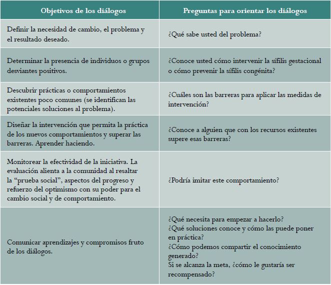 Una metodología con un enfoque de solución de problemas centrado en las necesidades de las personas y las comunidades es la desviación positiva (DP). Su aplicación busca promover cambios socioculturales y de comportamiento, partiendo de la premisa de que en todas las comunidades existen individuos, denominados desviantes positivos, cuyos comportamientos poco convencionales les permiten encontrar mejores soluciones a los problemas en comparación con sus pares, a pesar de contar con los mismos recursos 14. La DP se basa en diálogos de descubrimiento acción (DDA), en los que se identifican los individuos que ya exhiben el comportamiento deseado y obtienen resultados positivos (desviantes positivos); de esta manera, se diseñan intervenciones que permitan a otros adoptar estos comportamientos y se realiza un seguimiento de los resultados (ver Material complementario).