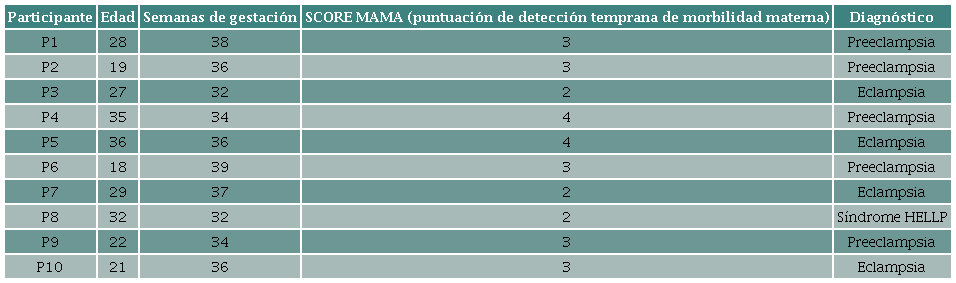 Participaron 10 mujeres ingresadas a servicios de cuidados intensivos, con un intervalo de edad entre los 18 a 36 años. Se utilizó el intervalo de SCORE MAMA entre 2 y 4, sistema de puntuación de alerta temprana de morbilidad materna, desarrollado por el Ministerio de Salud Pública del Ecuador 14, que tiene como objetivo clasificar el riesgo obstétrico de las mujeres gestantes y puérperas (Tabla 1).