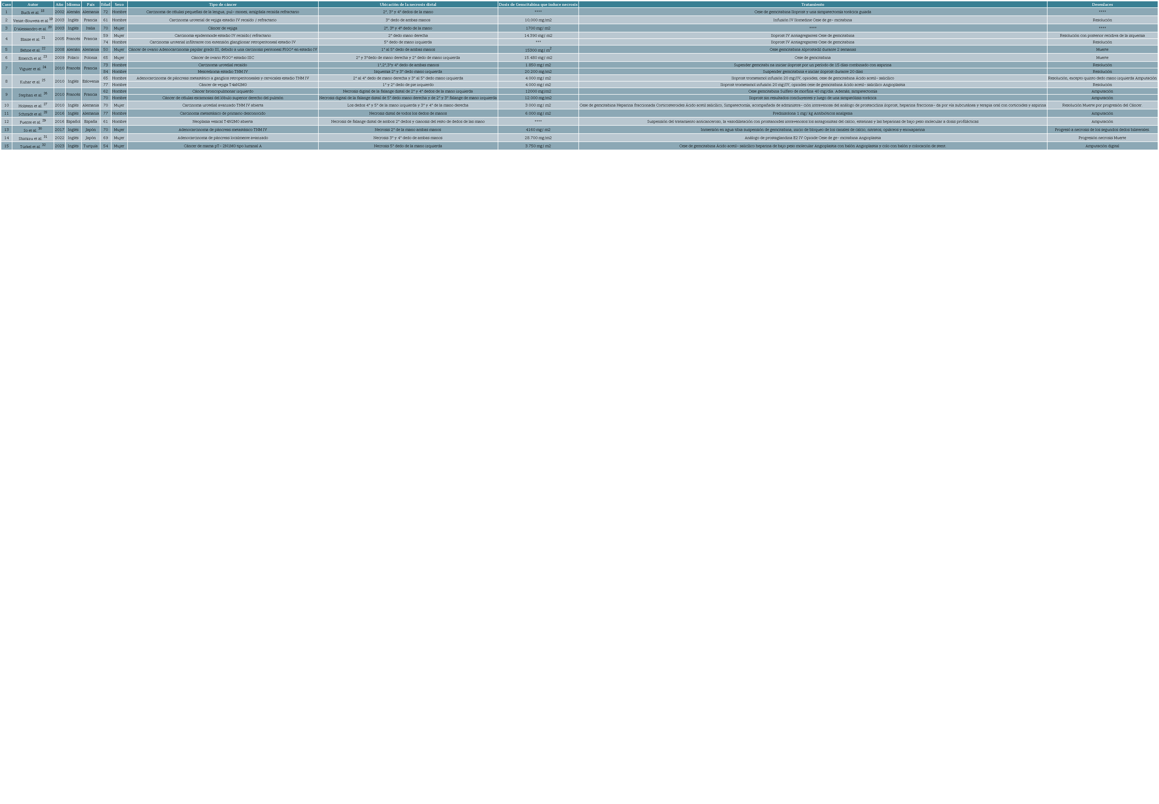Pronóstico: la necrosis de los dedos afectados requirió la amputación digital en seis casos (32 %) 25,26,28,29,32. En tres (16 %), la necrosis digital se extendió a pesar del tratamiento médico 21,30,31. En ocho casos (42 %) 19,21,24,25,27, los síntomas se resolvieron después de la suspensión de la gemcitabina y del tratamiento para la isquemia. Cuatro casos fallecieron (21 %) 22,23,27,31 como resultado de la progresión del cáncer.